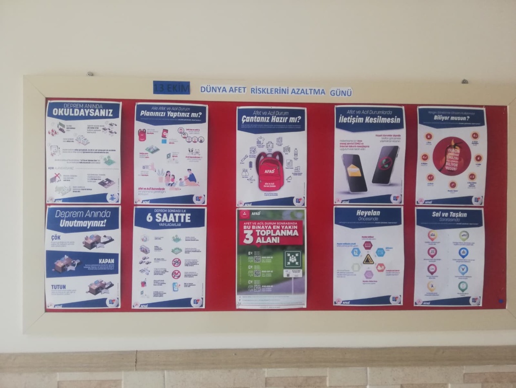 13 Ekim “Afet Risklerinin Azaltılması Günü” kapsamında afet bilincini artırmak amacıyla Afete Hazırlık Kulübü öğretmen ve öğrencileri tarafından pano hazırlandı. Okul genelinde tatbikat gerçekleştirildi. Öğrenciler ve öğretmenlerin katılımıyla yapılan tatbikatta, deprem anında ve sonrasında yapılması gereken doğru davranışlar uygulamalı olarak gösterildi.